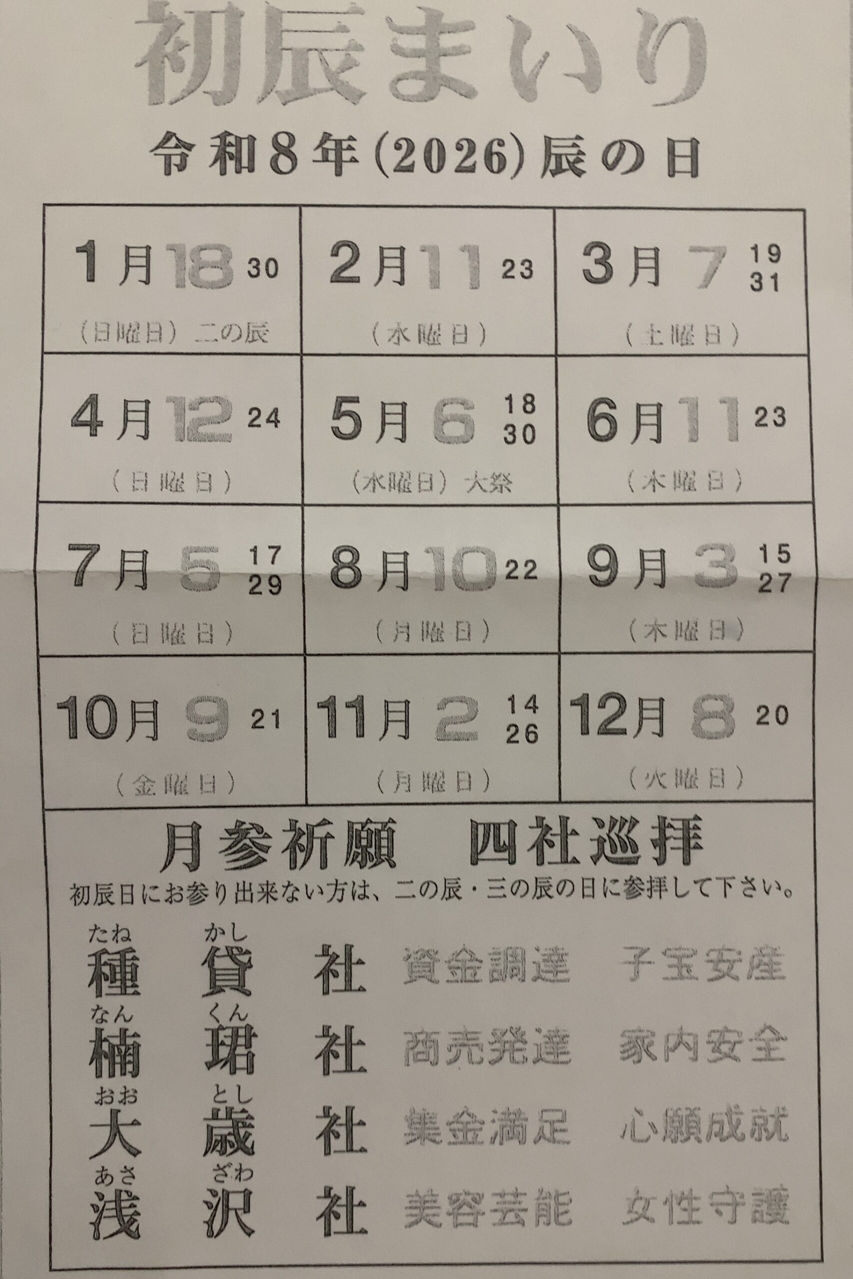 令和8年(2026年) 初辰詣りの日程 一覧表